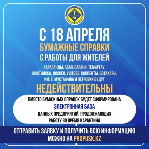 С 00 часов 18 апреля 2020 года бумажные справки с места работы будут недействительны в Караганде, Абае, Сарани, Темиртау, Шахтинске, а также в населённых пунктах Бухар-Жырауского района: Доскее, Уштобе, Кокпекты, Ботакаре, им. Г. Мустафина, Петровке.