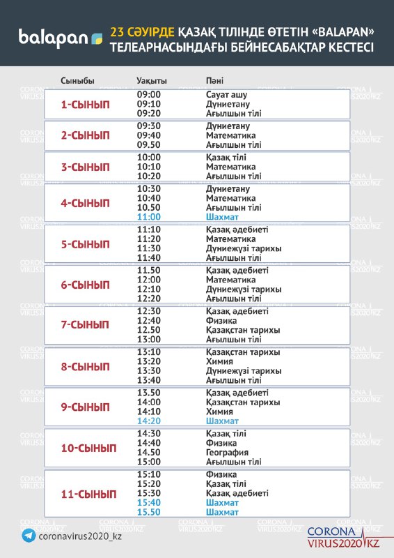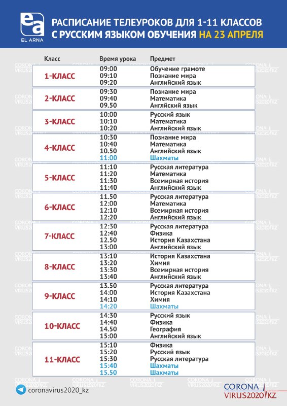 В расписании, представленном Оперативным штабом Госкомиссии, обозначены уроки для всех классов, с 1 по 11. Вещание на телеканалах «Ел Арна» и «Балапан» начнется в 9.00, а последний урок завершится в 15.50.