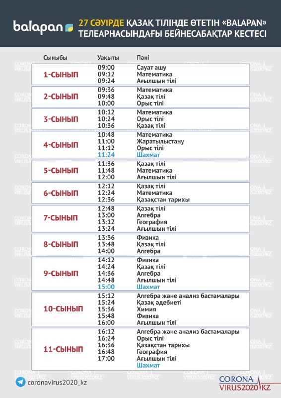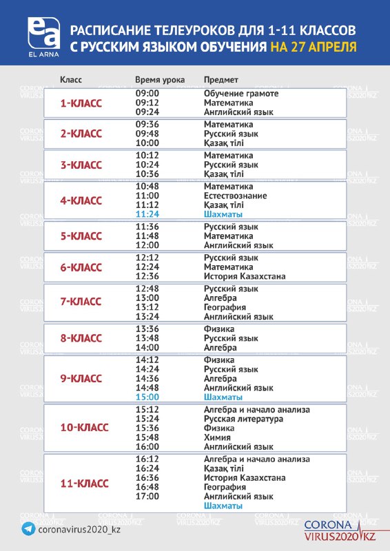 В расписании, представленном Оперативным штабом Госкомиссии, обозначены уроки для всех классов, с 1 по 11. Вещание на телеканалах «Ел Арна» и «Балапан» начнется в 9.00, а завершится в 17.00.