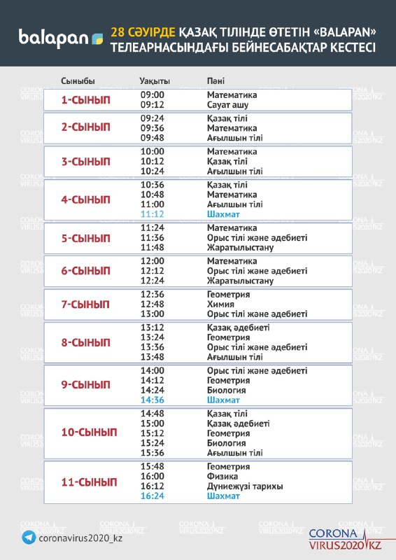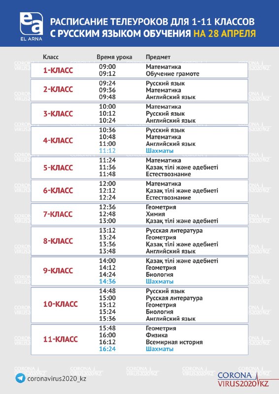 В расписании, представленном Оперативным штабом Госкомиссии, обозначены уроки для всех классов, с 1 по 11. Вещание на телеканалах «Ел Арна» и «Балапан» начнется в 9.00, а завершится в 16.24.