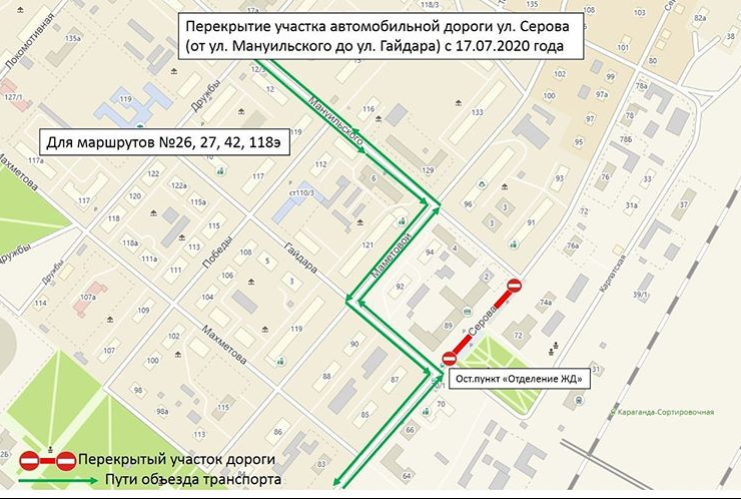 Как сообщают в ГУ "Отдел КХ, пассажирского транспорта и автомобильных дорог города Караганды", в связи с проведением работ по среднему ремонту дороги по улице Серова, участок автомобильной дороги от улицы Мануильского до улицы Гайдара с 17 июля будет перекрыт.