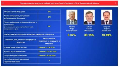 По информации ЦИК, в Карагандинской области явка выборщиков составила 98%. По предварительным результатам, Сергей Ершов сохранил мандат сенатора и остаётся в верхней палате на второй срок. За него принявшие участие в выборах депутаты маслихатов отдали большинство голосов - 83,15%.