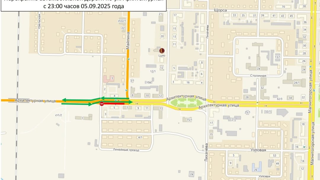 Пятого сентября с 23.00 часов будет перекрыта половина проезжей части по улице Архитектурная в районе перекрёстка с улицей Майлина. Движение автомобилей организуют по другой половине дороги ...
