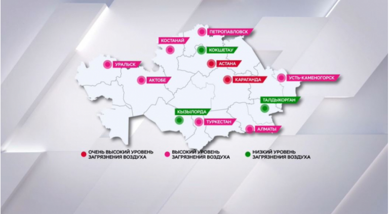 Загрязнённый воздух также в Алматы, Усть-Каменогорске, Туркестане, Петропавловске, Костанае, Уральске и Актобе. В списке «зелёных» городов, то есть более чистых: Кокшетау, Кызылорда и Талды...