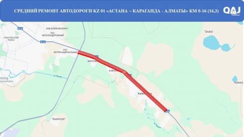На автомобильной дороге республиканского значения KAZ01 Астана – Караганда (с обходом) – Алматы на участке с 0 по 16,3 км продолжаются работы по среднему ремонту дорожного полотна. Ремонт затрагивает отрезок от путепровода на обходе столицы до пункта взимания платы за населённым пунктом Жибек Жолы, сообщает корреспондент ekaraganda.kz.