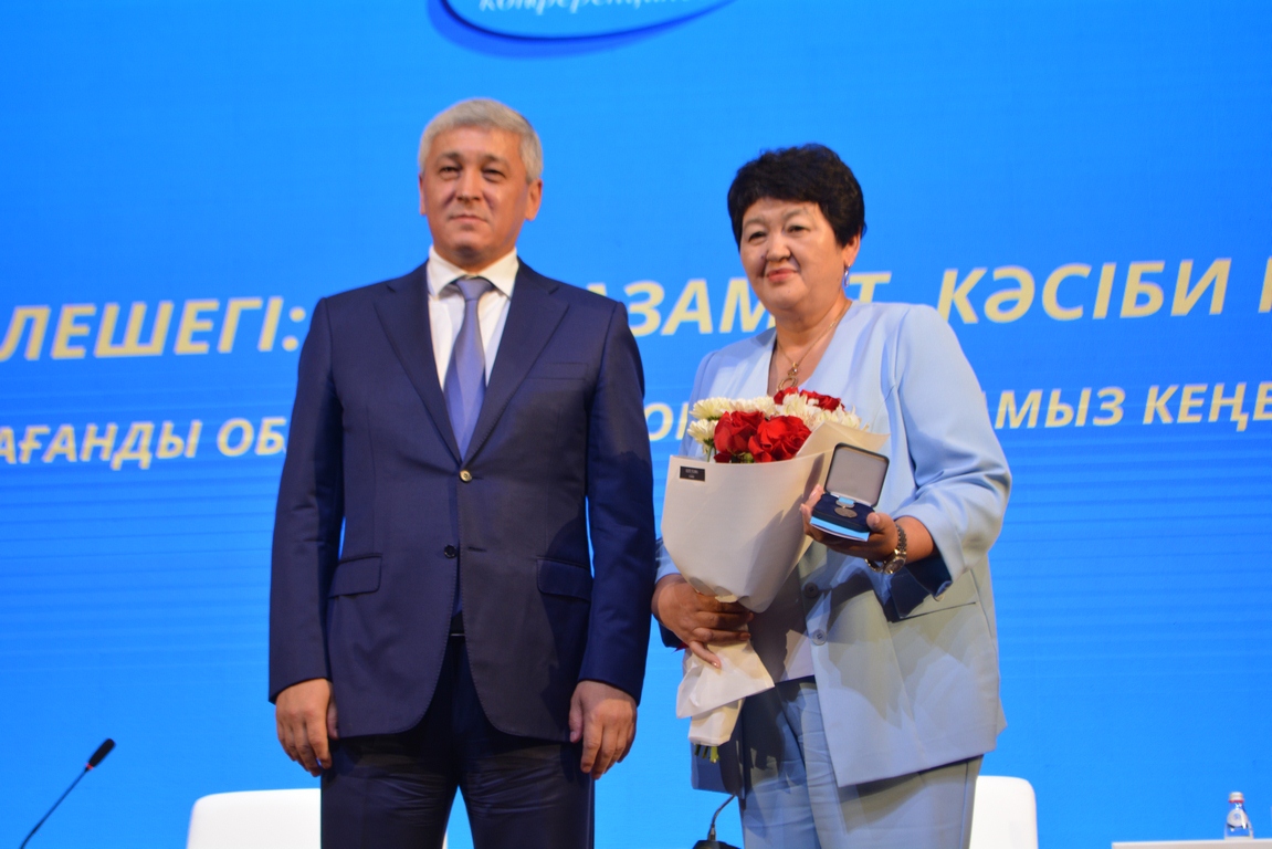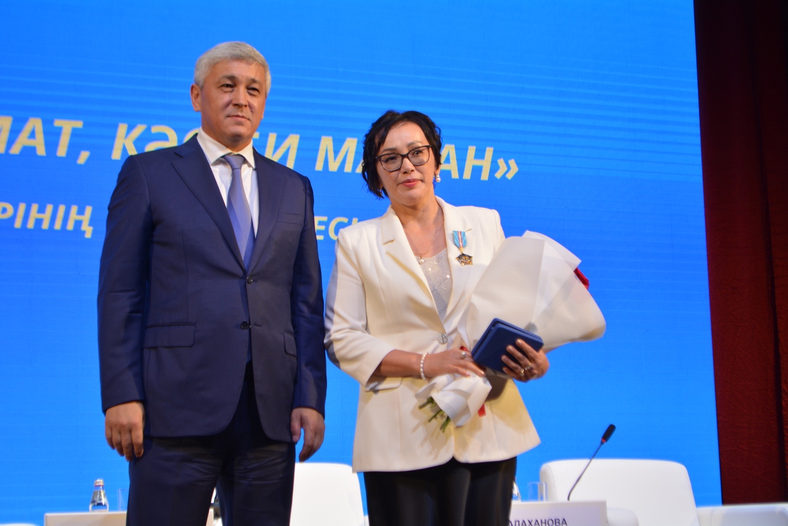 "Алырай Алтынсарин" төсбелгісін Қарағанды облысының білім беруді дамыту оқу-әдістемелік орталығының директоры Бақытгүл Әбдікерова алды.