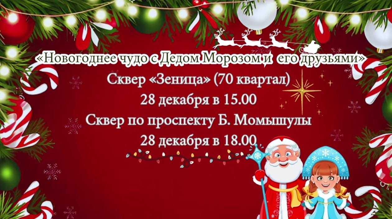 28 желтоқсанда сағат 15:00-де жаңа жылдық ертегі 70 – ші тоқсандағы "Зеница" алаңына, ал 18:00-де Б.Момышұлы даңғылындағы алаңға келеді.