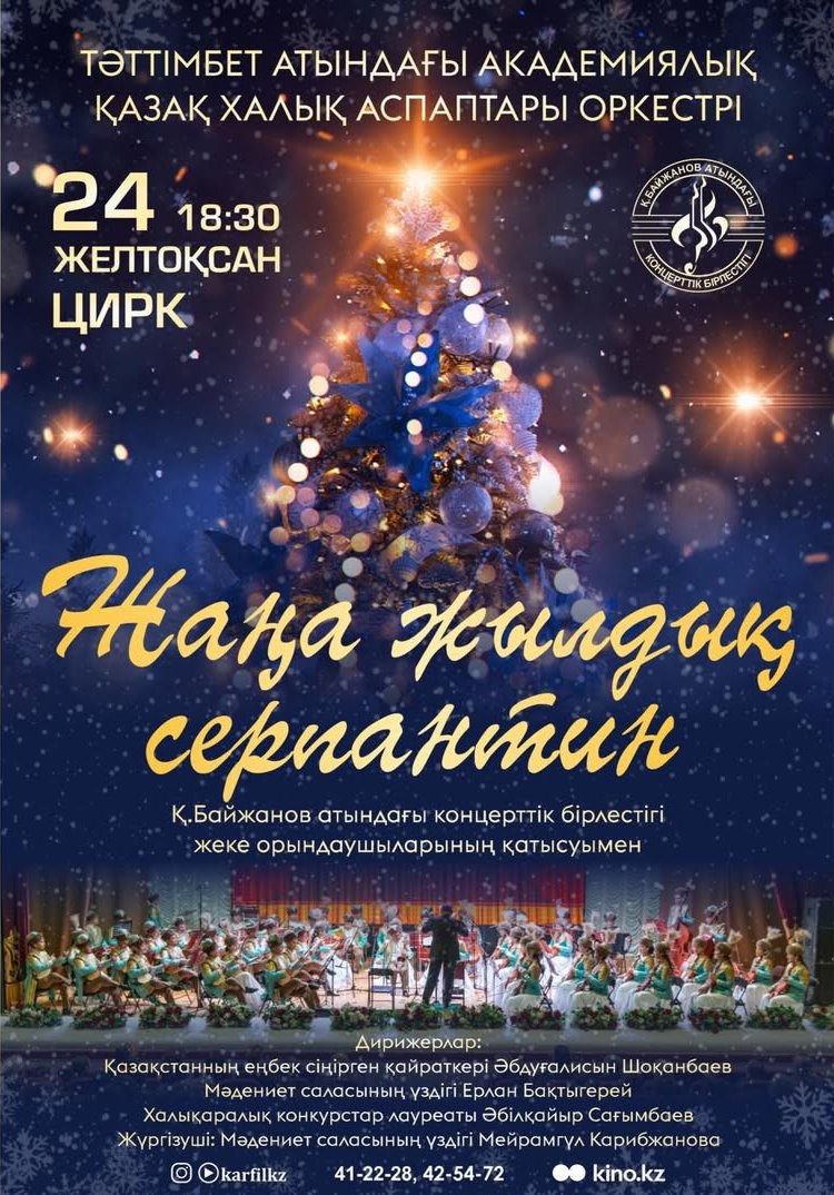 24 желтоқсан күні сағат 18.30-да цирк сахнасында Тәттімбет атындағы Қазақ халық аспаптар оркестрі өнер көрсетеді. "Жаңа жылдық серпентин" атты кешті Мейрамгүл Кәрібжанова жүргізеді, ал дирижерлік пульттің артында Қазақстанның еңбек сіңірген қайраткері Әбдіғалисын Шоқанбаев, Мәдениет үздігі культурыан Бақтыгерей және халықаралық байқаулардың лауреаты Әбілқайыр Сағымбаев болады.