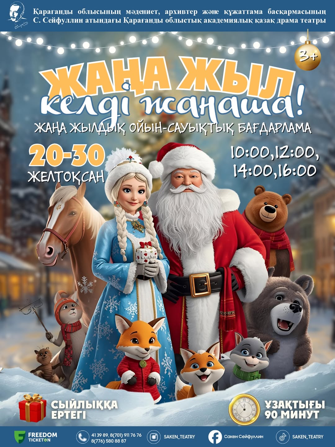 С. Сейфуллин атындағы Академиялық драма театрында да жаңа жылды жарқын және көңілді қарсы алады – қойылымдар 20-30 желтоқсан аралығында өтеді. Мұнда да жас және ересек қонақтар ертегі әлеміне – ерекше кейіпкерлерге, билерге, әндерге және көңіл көтеруге толы ұмытылмас атмосфераға жіберіледі.