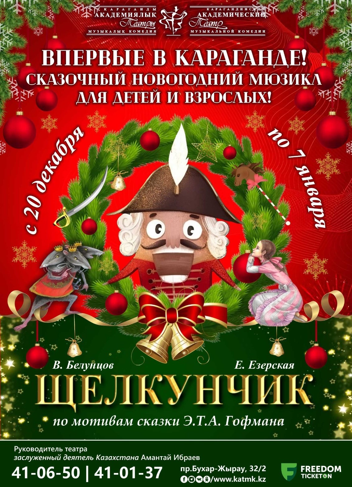 Академиялық музыкалық комедия театрында 20 желтоқсан мен 7 қаңтар аралығында "Щелкунчик"мюзиклінің көрсетілімдері өтеді. Сиқырлы ойыншық туралы әйгілі ертегі мұнда жаңа тәсілдермен айтылады: классикалық және джаз музыкасының түстерінде, классикалық және заманауи бидің реңктерінде. КАТМК командасымен бірге қойылымда өте мәртебелі команда – композитор Владимир Белунцов, Санкт-Петербургтен халықаралық байқаулар мен фестивальдердің лауреаты, суретші Татьяна Королева, мюзикл балетмейстері Денис Айзин және режиссер Татьяна Боброва жұмыс істеді.