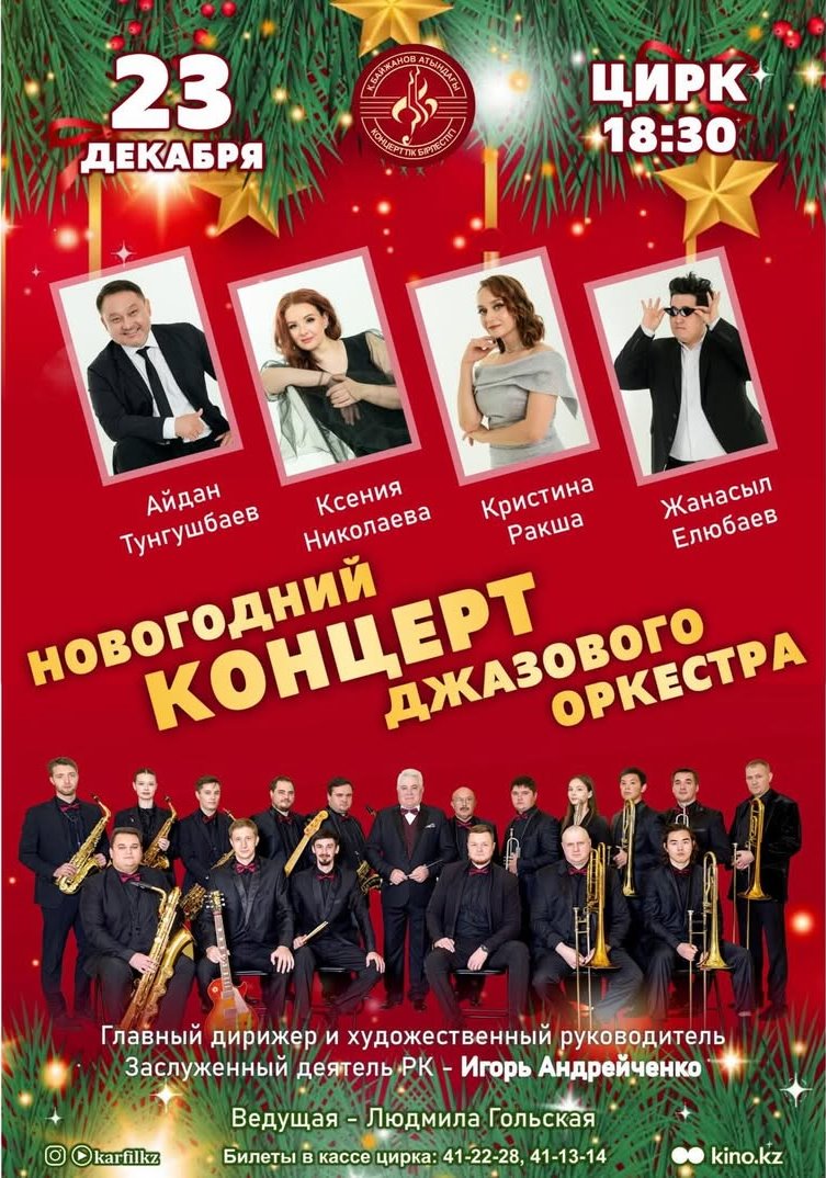 23 желтоқсан күні сағат 18.30-да цирк сахнасында "Биг-Бэнд" джаз оркестрі, ал ұжыммен бірге солистер Айдана Тунгушбаев, Ксения Николаева, Кристина Ракша және Жаңасыл Елубаев өнер көрсетеді. Жүргізуші-Людмила Гольская, дирижерлік пульттің артында – ҚР еңбек сіңірген қайраткері, маэстро Игорь Андрейченко.