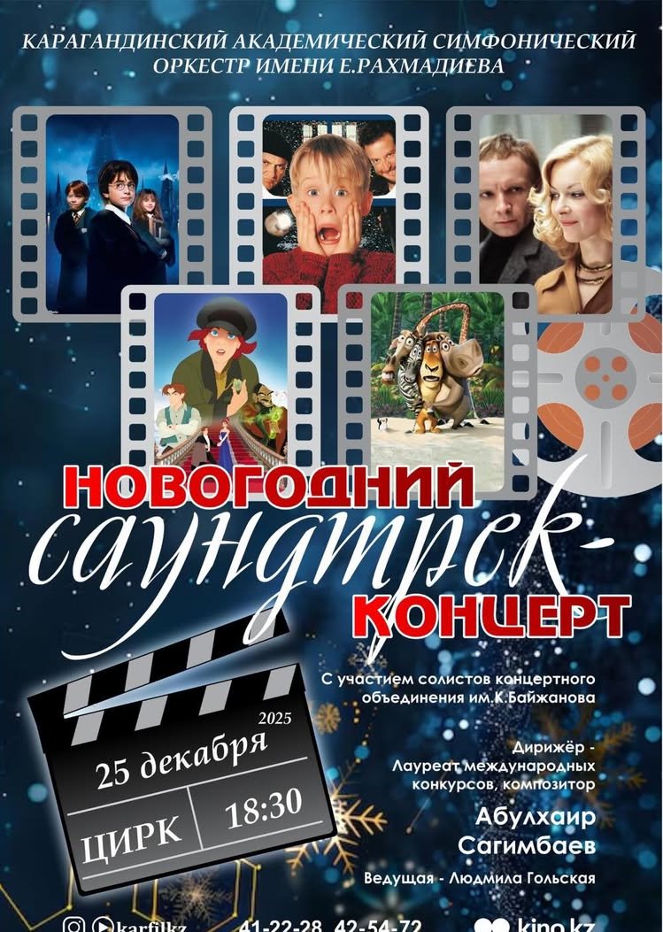 Ал 25 желтоқсанда сағат 18.30-да цирк сахнасында Е.Рахмадиев атындағы академиялық симфониялық оркестр концерт береді. Мұнда оркестр филармония солистерімен бірге орындайтын танымал фильмдерге жаңа жылдық саундтректер қойылады. Жүргізуші-Людмила Гольская, дирижер-халықаралық байқаулардың лауреаты Әбілқайыр Сағымбаев.