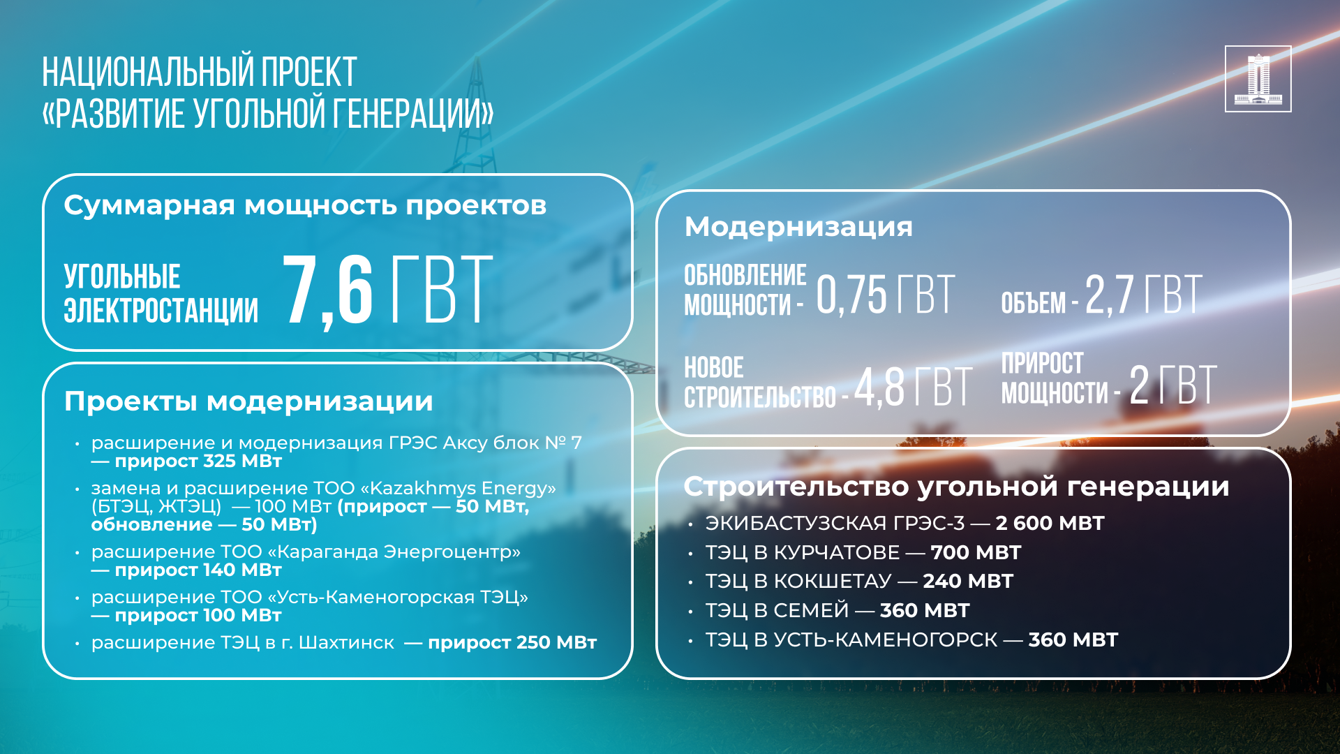 Президенттің тапсырмасы бойынша "таза көмір"технологияларын қолдана отырып, көмір генерациясын дамыту бойынша жеке жоба әзірленуде. Жоспарға жалпы қуаты 7,6 ГВт7 болатын жобалар кіреді.