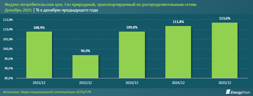 Баға динамикасы ішкі нарықтағы жүктемені күшейтеді. Тарату желілері арқылы тасымалданатын табиғи газ өткен жылдың желтоқсан айының қорытындысы бойынша 2024 жылдың желтоқсанына қарай 13,6%-ға қымбаттады.