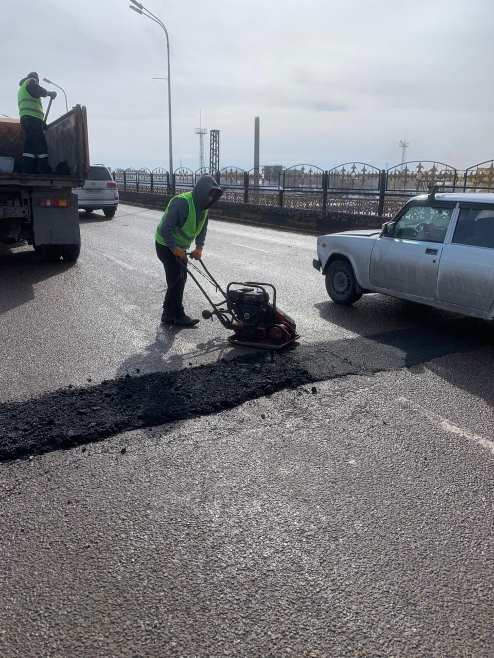 "Көктем баяу басталып, ауа — райы бізге суық асфальтпен шұңқырлы жол жөндеуді бастауға мүмкіндік берді", - деп жазды Мейрам Кожухов.