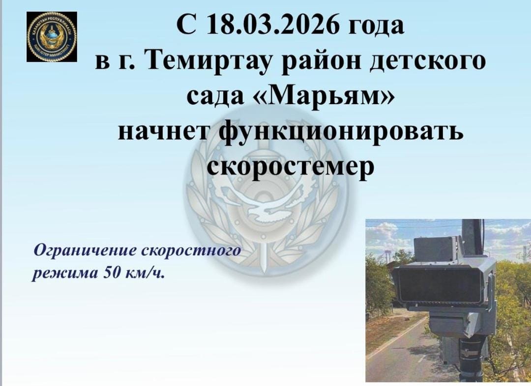 Қарағанды облысы ПД ақпараты бойынша, 18 наурыздан бастап Теміртауда "Мәриям"балабақшасы ауданында жаңа жылдамдық өлшегіш жұмыс істей бастайды. Камера белгіленген жылдамдық режимінен асып кетуді тіркейді, деп хабарлайды корреспондент ekaraganda.kz.