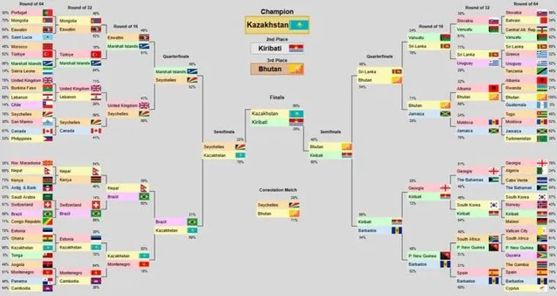 Жартылай финалда Қазақстан туы Сейшел Аралдарының туын жеңді, ал финалда кирибатидің мемлекеттік нышанынан озып кетті. Дауыс беру қорытындысы бойынша үшінші орын Бутан туына бұйырды.
