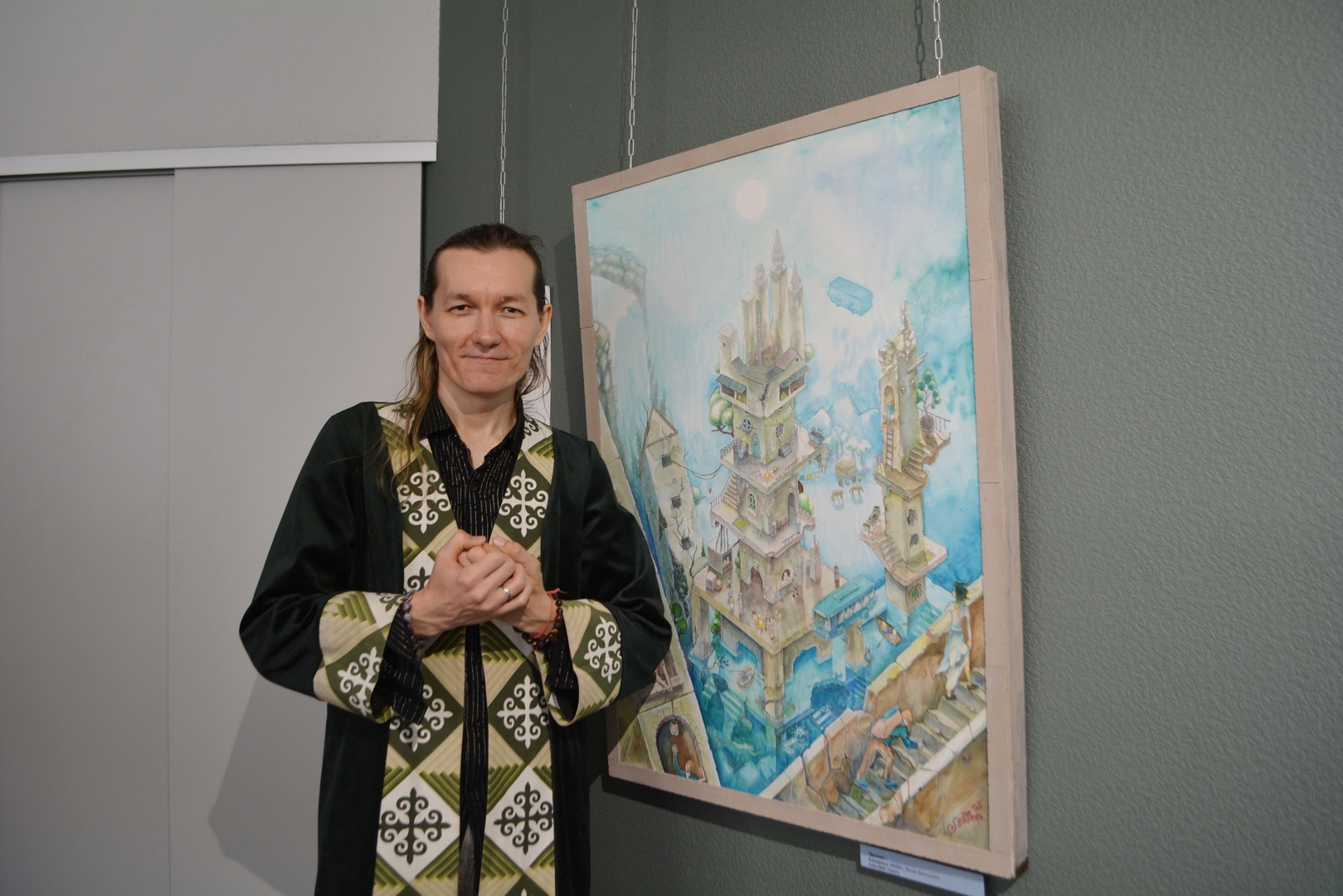 "Сонымен қатар, "мұнара" картинасының аннотациясында мен бірнеше сөздерді әртүрлі түстермен бөлдім. Адамда әртүрлі энергия бар, мен мұнда кескіндеменің реңктерімен параллель жасадым. Мысалы, жасыл түс өмір мен табиғатқа деген сүйіспеншілікті білдіреді, қоңыр – теңдік, тәжірибе, өткен, оқу және отбасы, хаки – жылдамдық, қозғалыс, шеберлік және әрекет туралы. Осы түстермен боялған аннотациядағы сөздер суреттегі реңктермен сәйкес келеді", - дейді Петр.