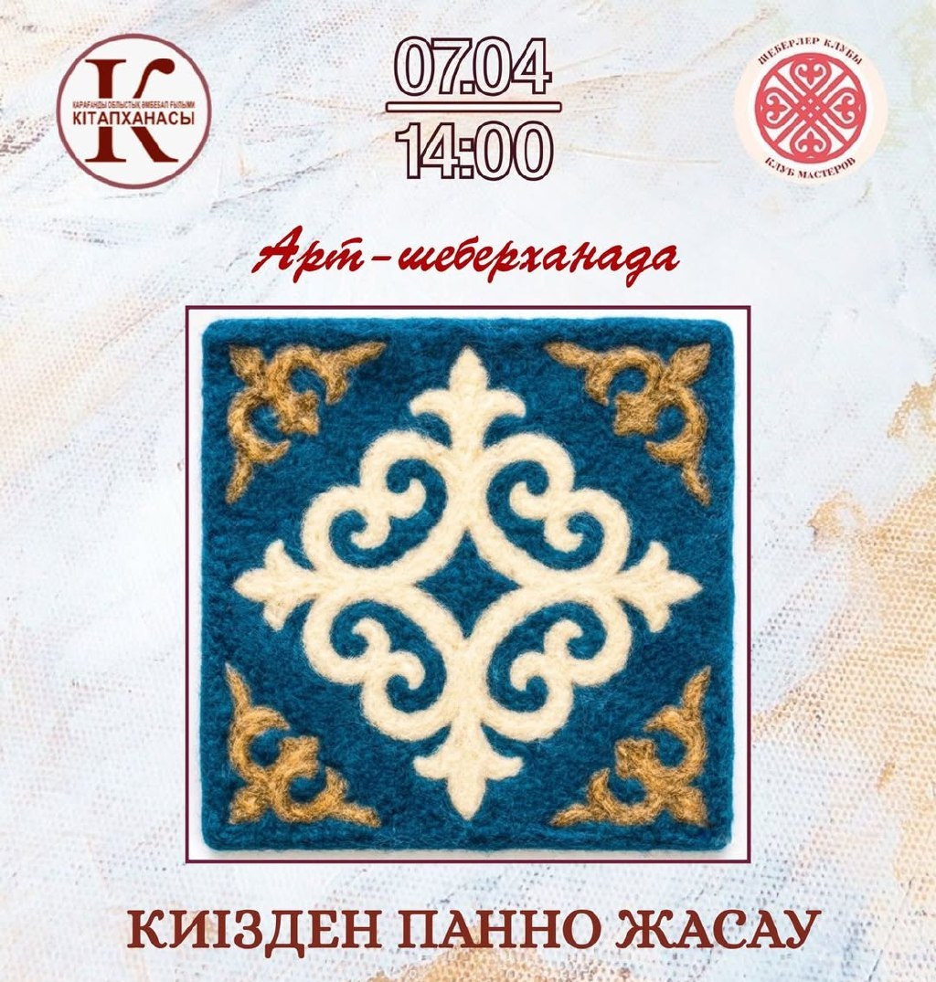 Н.В. Гоголь атындағы Қарағанды облыстық әмбебап ғылыми кітапханасында (Ерубаев көшесі, 44) 7 сәуірде сағат 14.00-де "киізден жасалған Панно"арт-шеберханасы өтеді. Оны "қазақ ою-өрнегі: шығармашылық кітапханасы" жобасы аясында ұйымдастырады. Тілек білдірушілер үшін кіру тегін, алайда орын саны шектеулі және алдын ала тіркелу қажет, деп хабарлайды Тілші ekaraganda.kz.