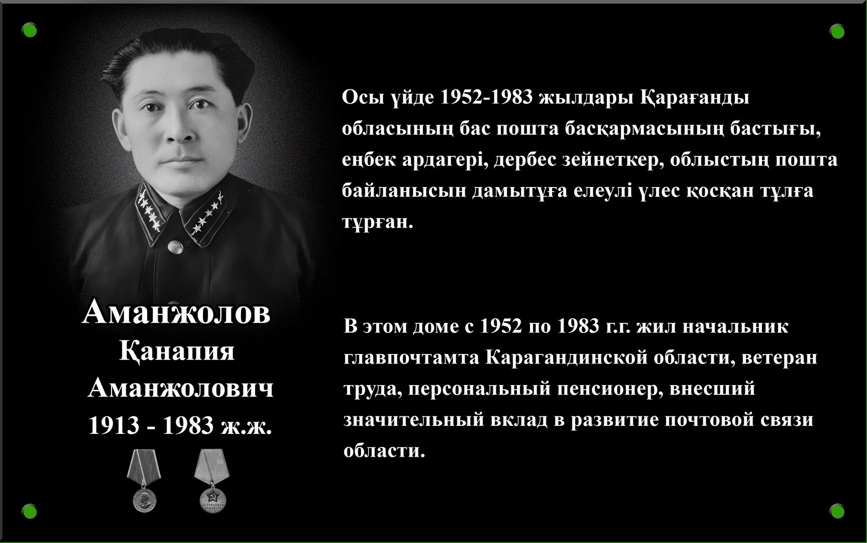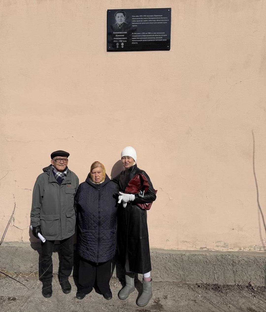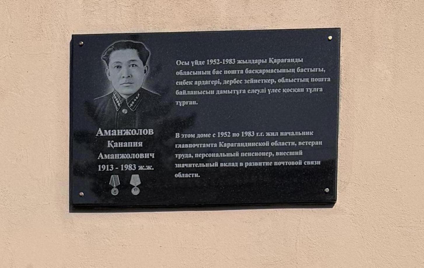 Фото Қанапия Аманжоловтың туыстарының рұқсатымен Жақында Қарағандыда жаңа мемориалдық тақта пайда болды: ол Ерубаев көшесі, 3 мекенжайында орнатылды. Қара гранит тақтасы Қанапия Аманжоловқа арналған және ол тұрған үйге орнатылған. Қанапия Аманжолов өңірдің пошта ісін дамытуға елеулі үлес қосты және белсенді өмірлік ұстанымға ие болды. Тақтаны орнатудың бастамашылары оның туыстары болды, деп хабарлайды Тілші ekaraganda.kz.