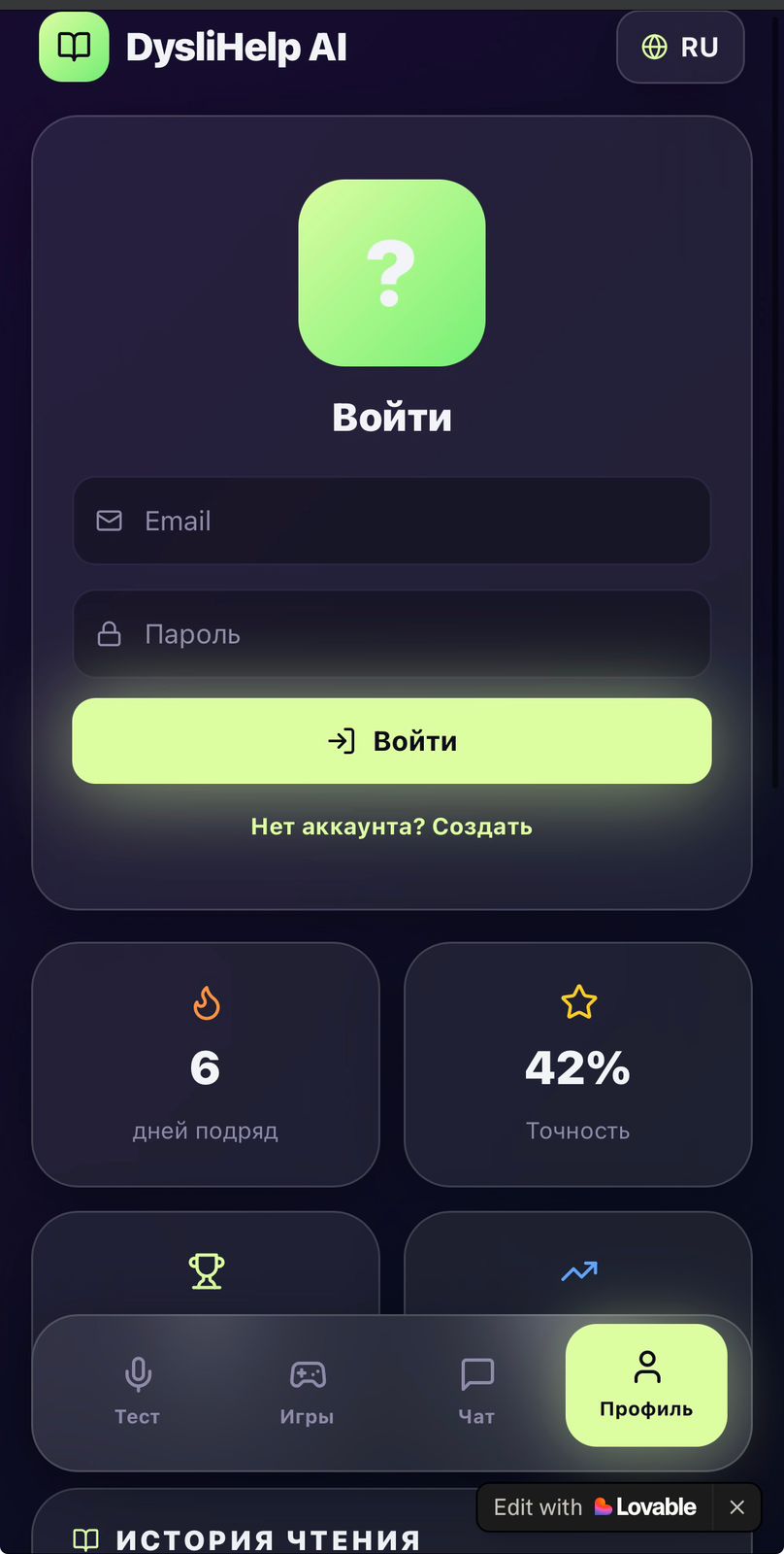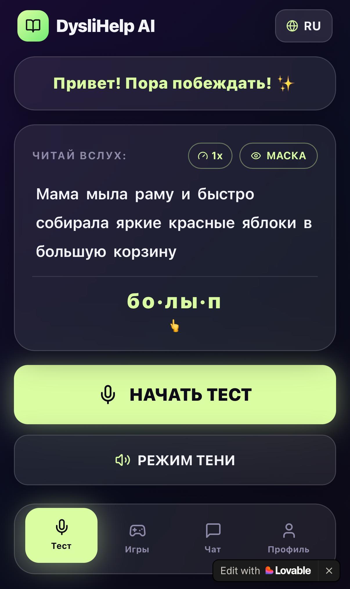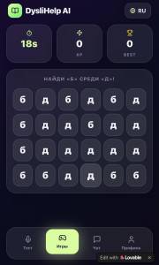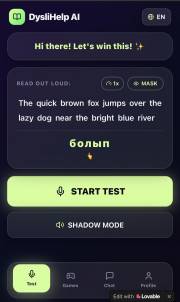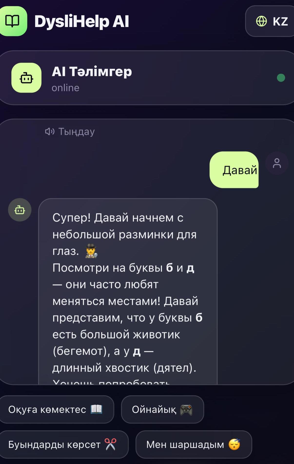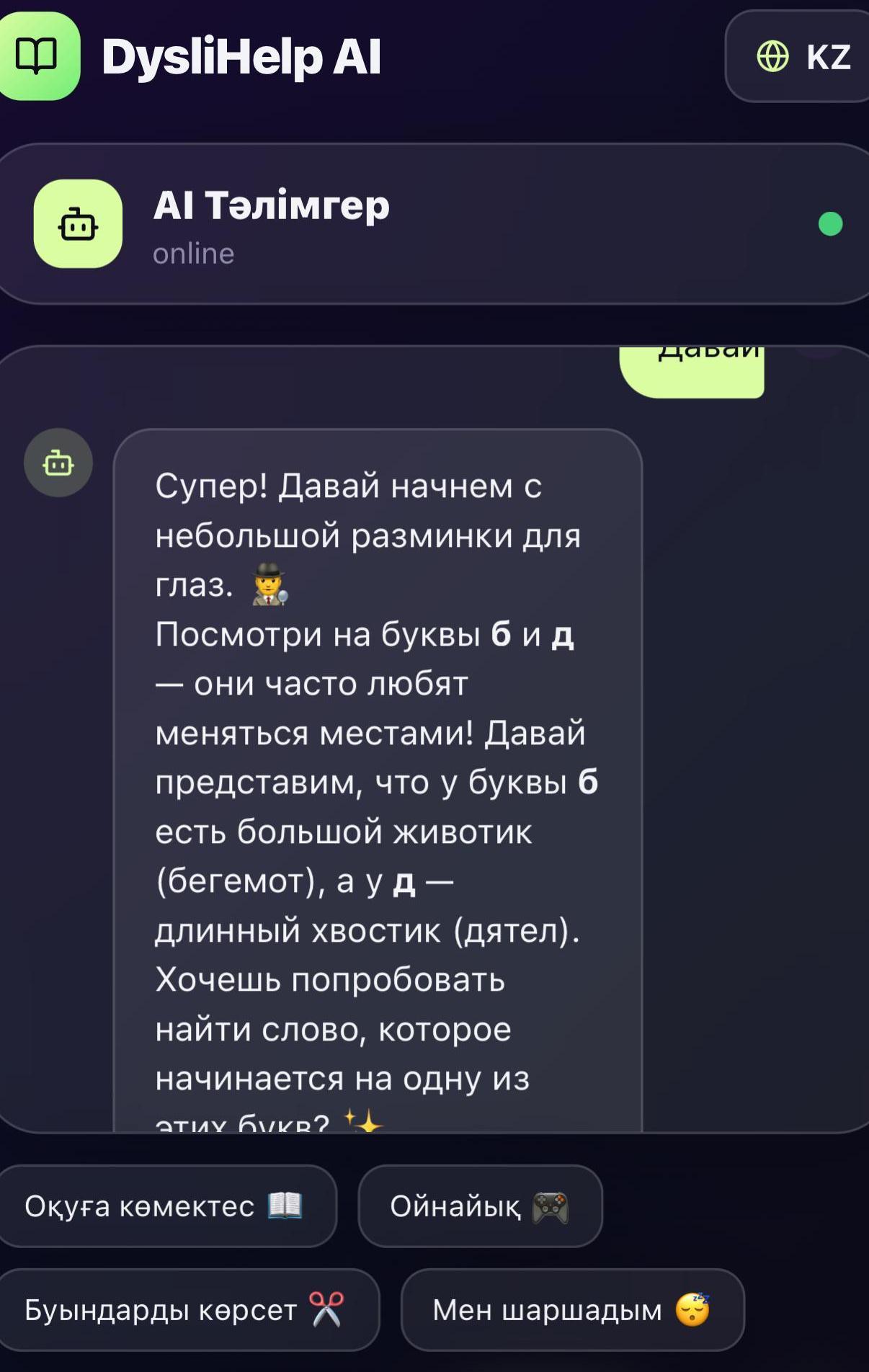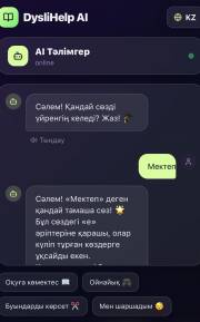 AI негізінде жасалған dyslihelp ai чатботына келетін болсақ, ол қолданбада оқу көмекшісі ретінде әрекет етеді. Чатбот достық қарым-қатынаста және ұсынылған сөзді буындарға бөлуге көмектесуге дайын. Сонымен қатар, бот әріпті ассоциациялар бойынша есте сақтауды ұсынады – мысалы, әріп қандай. Сіз боттан сөзді немесе сөйлемді айтуды сұрай аласыз.