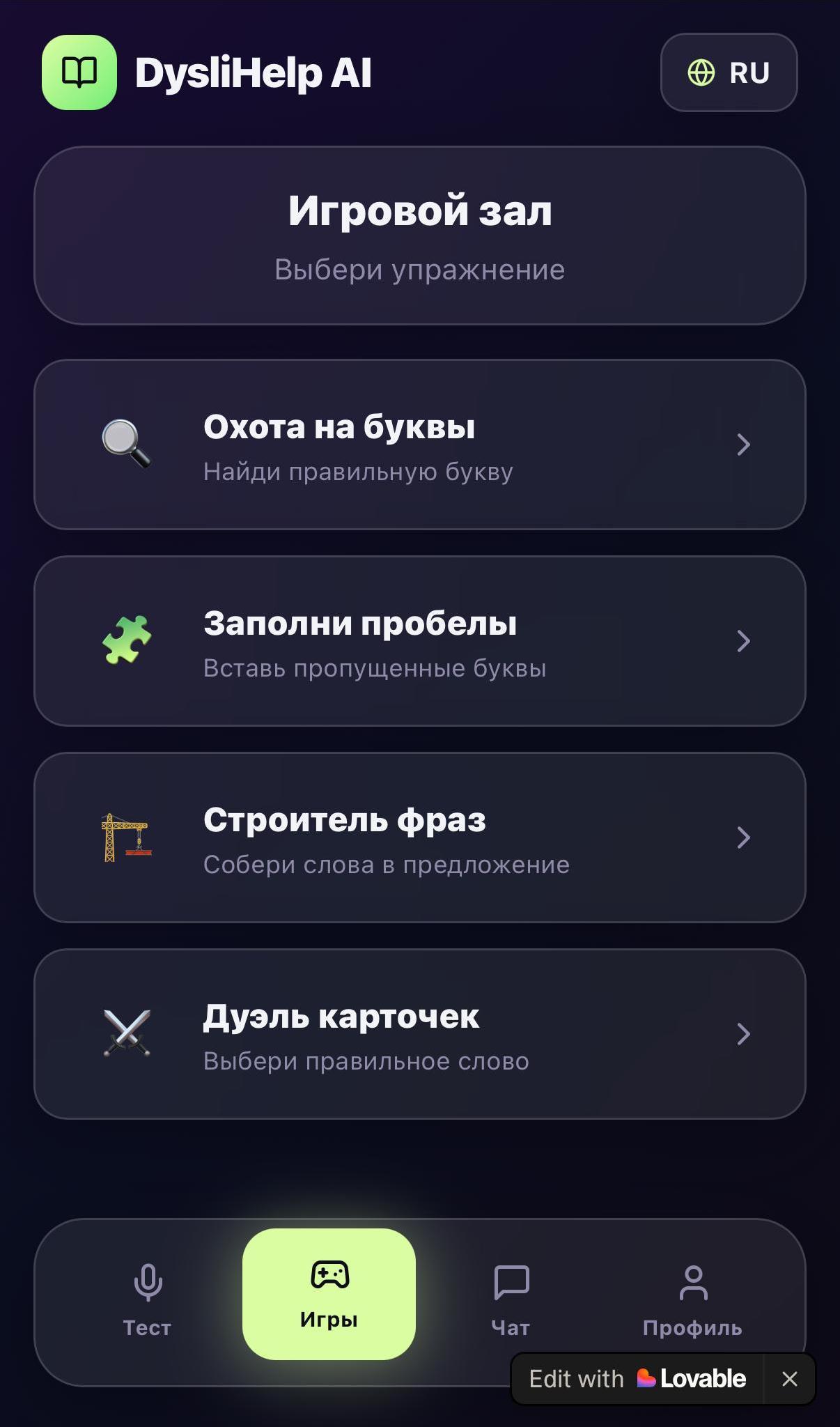 DysliHelp-те "ойын залы" бар: мұнда сіз ойын түрінде оқуға үйрете аласыз – "әріптерді аулау" ұсынылады (ұсынылған әріптерден дұрыс әріпті табу керек, біраз уақыт), "бос орындарды толтыру" (жетіспейтін әріптерді енгізу), "сөз тіркестерін жасаушы" (сөздерді сөйлемге жинау) және "карточкалар дуэлі" (дұрыс сөзді таңдау керек). Әр ойында үш қиындық деңгейі бар.