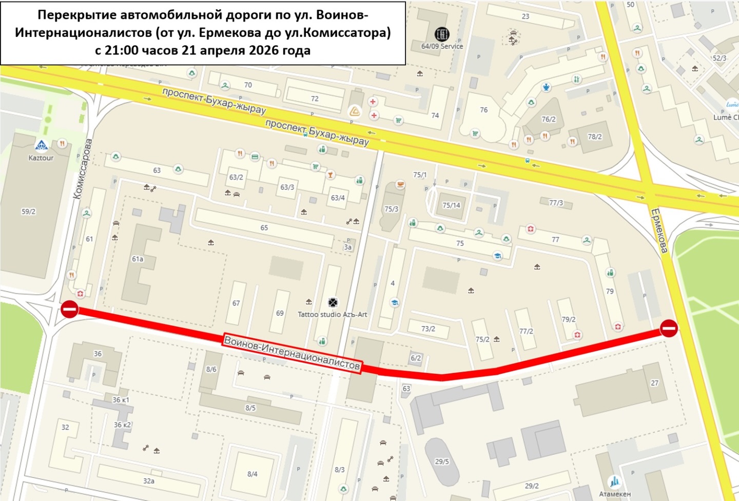 Қарағанды әкімдігінің ақпараты бойынша, 21 сәуірде сағат 21:00-ден бастап Ермеков көшесінен Комиссаров көшесіне дейін интернационалист – жауынгерлер көшесінің учаскесі жабылады. Шектеулер жол жұмыстарын жүргізу кезеңіне енгізіледі.