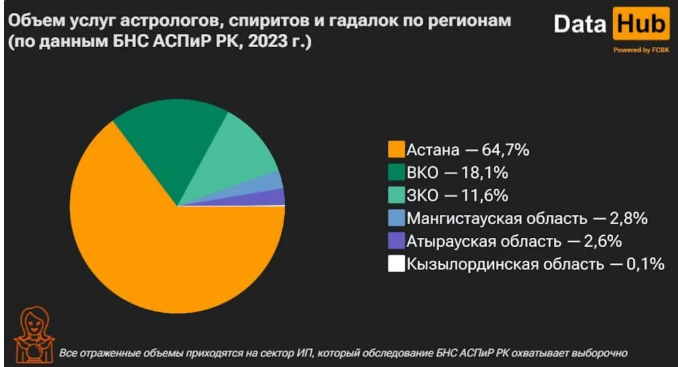 В 2023 году доходы астрологов, спиритов и гадалок в стране составили 39,1 млн тенге, причём все эти средства были получены через индивидуальных предпринимателей, что подтверждают данные БНС ...